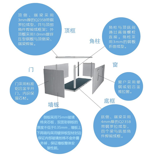 玉發(fā)達(dá)箱式房具有現(xiàn)場吊裝、安裝快捷、移動迅速、搬遷方便、利用次數(shù)多等 優(yōu)點,產(chǎn)品主框架為特殊型鋼板壓制而成,側(cè)板有特殊隔音、隔熱填充物,可起到隔熱隔音防寒防火的作用。
